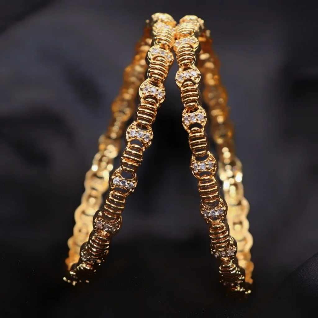 AD white stone oval shape ring design gold finish bangle. These are wonderfully woven with bright stone and made from mat finish metal. These bangles are premium quality and long lasting. These bangles are skin-friendly.