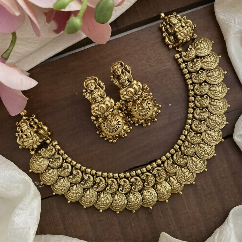 Indulge in the timeless elegance of this Antique Lakshmi Coin with Peacock Choker. Featuring a stunning antique Lakshmi coin pendant and intricate peacock design, this choker exudes luxury and sophistication….