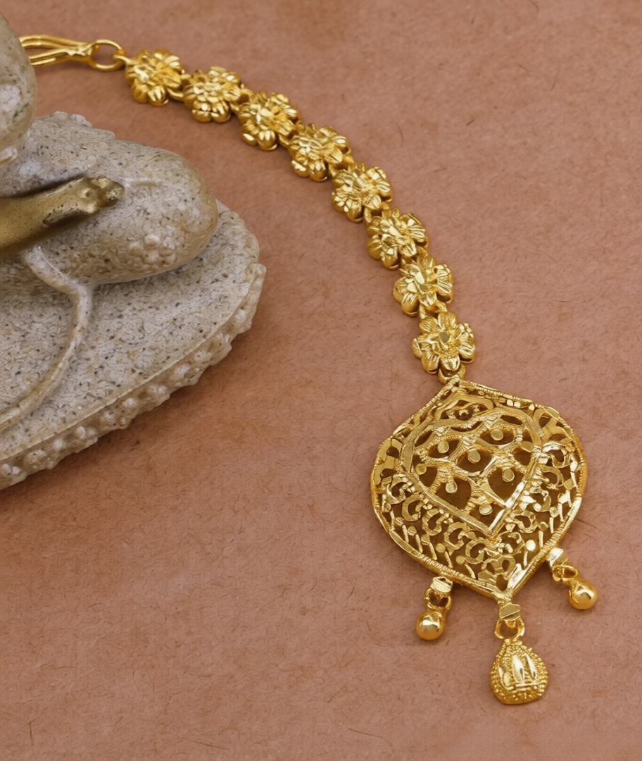 Adorn your bridal look with our exquisite **South Indian bridal jewelry gold tone Nethichutti**, featuring a captivating floral design, crafted to radiate timeless elegance and traditional charm. This Nethichutti, also known as Maang Tikka, is meticulously finished with a high-quality gold tone, designed to replicate the rich luster and intricate artistry of genuine South Indian gold jewelry. The centerpiece showcases a beautifully sculpted floral design, with delicate petals, elegant leaves, and graceful blossoms intricately detailed in gold. These floral motifs are often subtly enhanced with sparkling stones, adding a touch of brilliance that beautifully complements your bridal attire. Designed to sit gracefully on your forehead, this Nethichutti embodies the beauty and prosperity associated with traditional Indian flora, making it an ideal accessory for brides seeking a blend of cultural heritage and sophisticated style. It offers a luxurious look at an accessible price, ensuring you shine magnificently on your wedding day or any grand celebration.