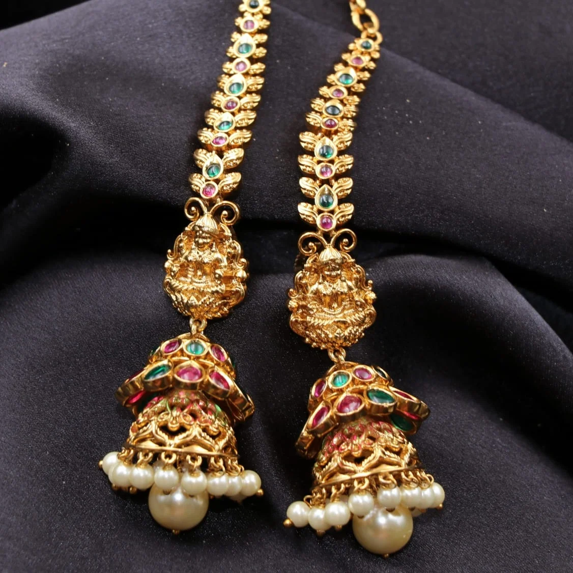 & Free ShippingTrendy lakshmi with kemp stone jimikki and attached miscellaneous pattern leaf design mattal. Lakshmi design as a stud and it is connected to leaves festooned with kemp stones on the top. The base of the stud has double jimikki attached. The first has filled with kemp stones and the below jimikki has decorated with pearls.