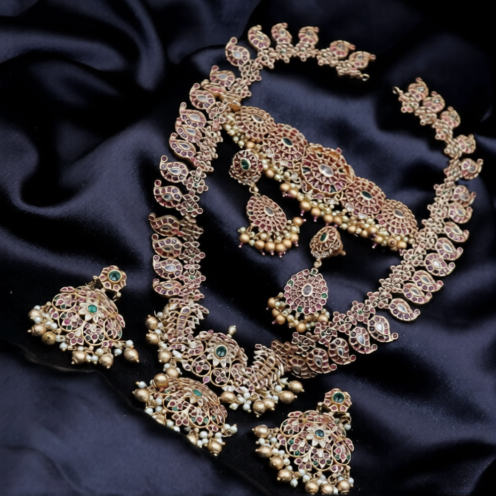 Premium Quality Mat finish Kemp stone manga with floral design haram set Combo set with matching earrings.