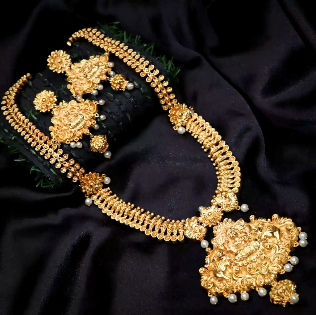Premium Quality Mat finish Temple pattern with Lakshmi pendant Haram set.