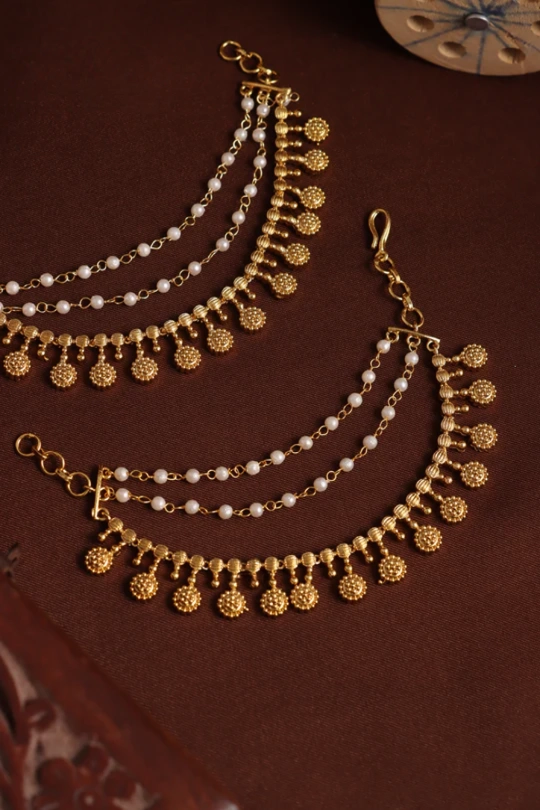 The Seetha Matte Pearl Layer Earchain is a beautifully crafted traditional accessory that adds a touch of elegance and grace to your ethnic look. Designed with a matte gold-tone finish and layered pearl detailing, this earchain enhances the beauty of your earrings while giving a rich, classic appearance.